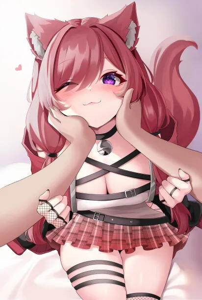 casual outfit - dress with gradient plaid at the bottom, loose side belt on the hips, fishnet on the left arm, arm strap on the right arm, bell choker, triple garter belt on left leg, thigh high fishnet on right leg, calf high belt boots, (in low pigtails usually)