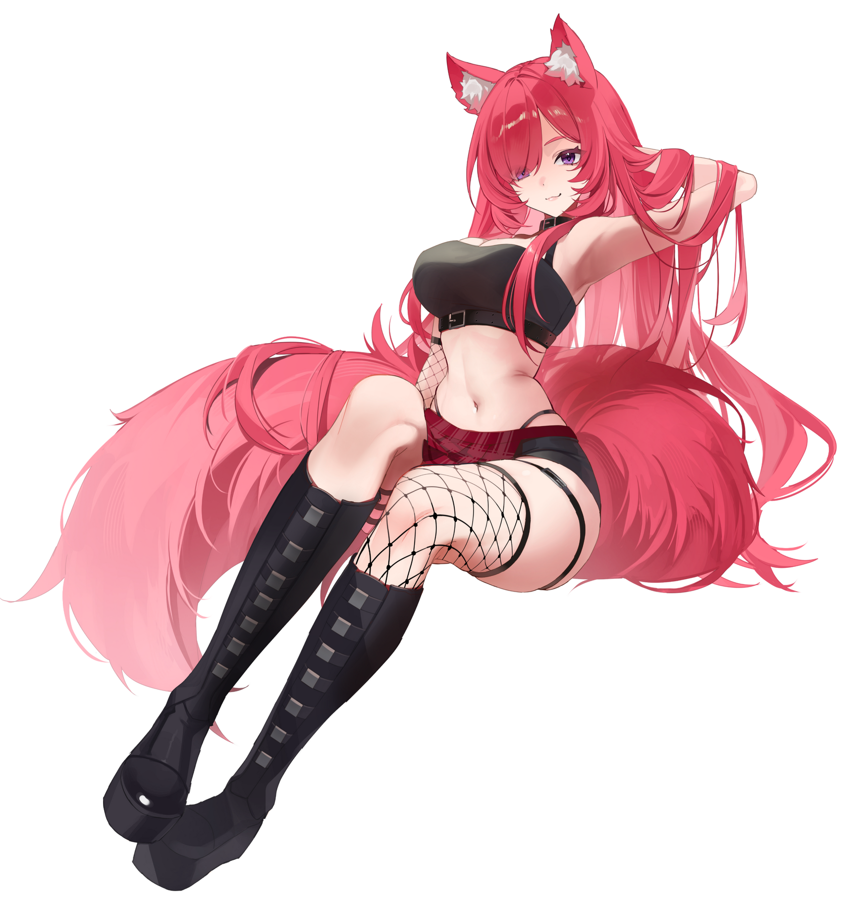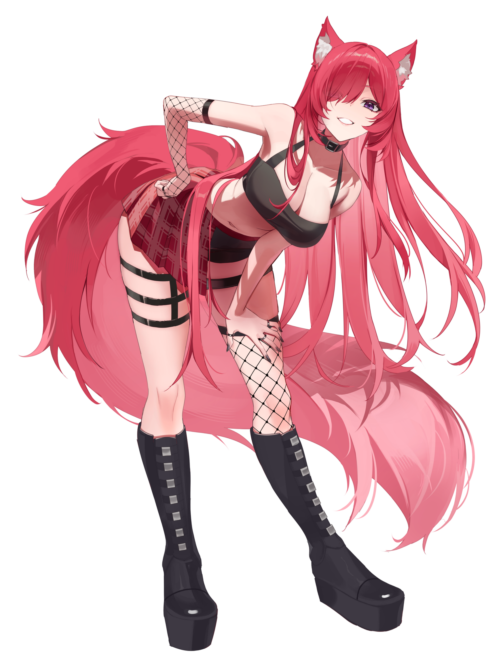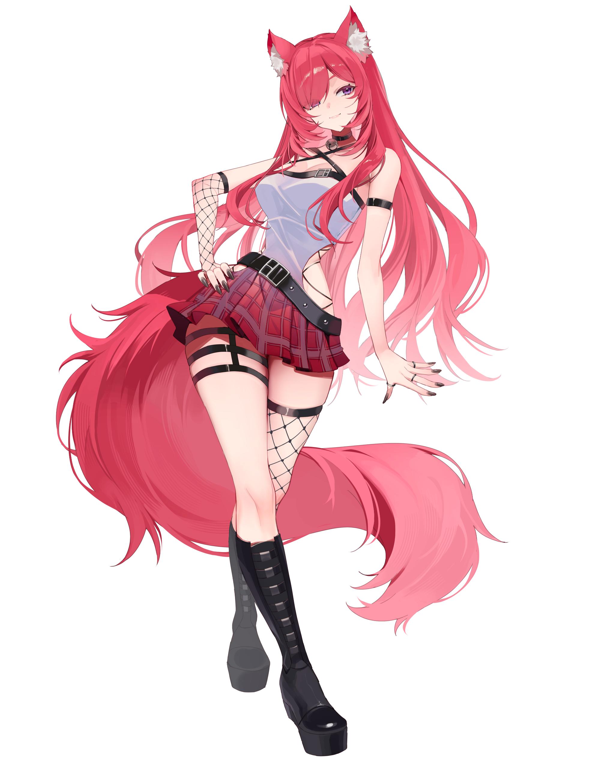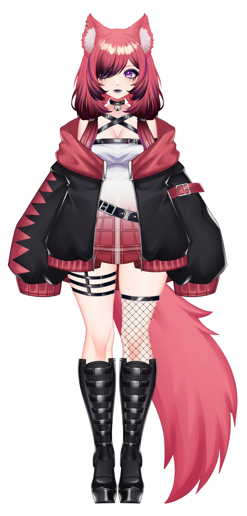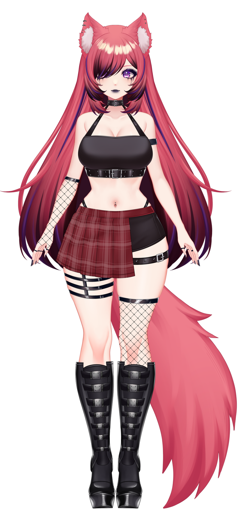 punk outfit- black tube top with belt choker, plaid half skirt half shorts, fishnet on the left arm, triple garter belt on left leg, thigh high fishnet on right leg, calf high belt boots, (hair fully down usually)