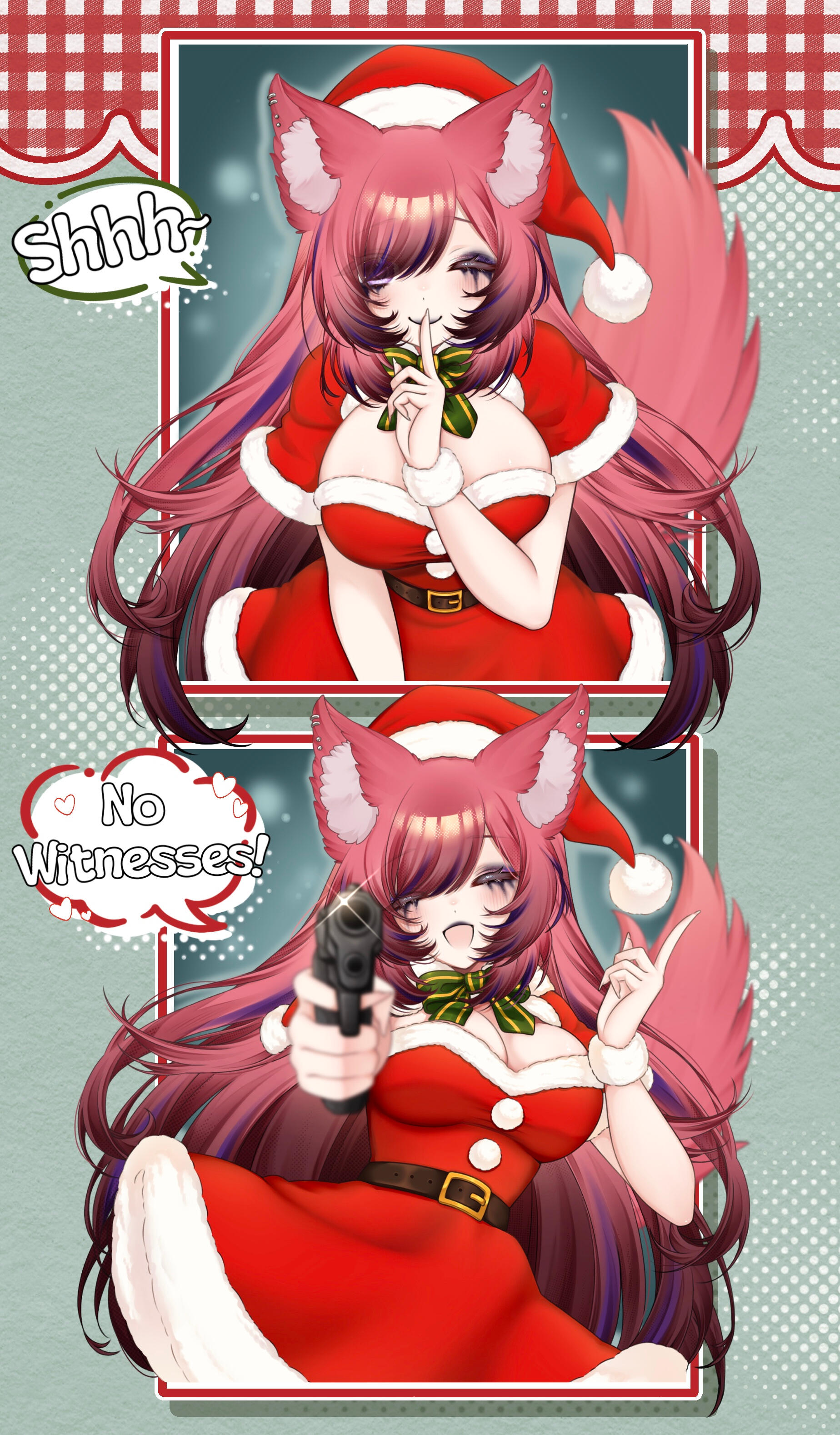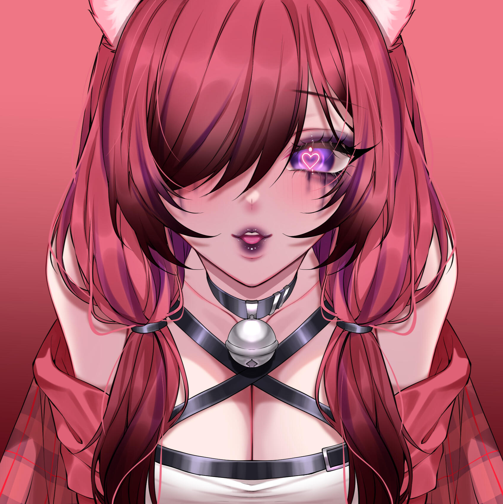 casual outfit - dress with gradient plaid at the bottom, loose side belt on the hips, fishnet on the left arm, arm strap on the right arm, bell choker, triple garter belt on left leg, thigh high fishnet on right leg, calf high belt boots, (in low pigtails usually)