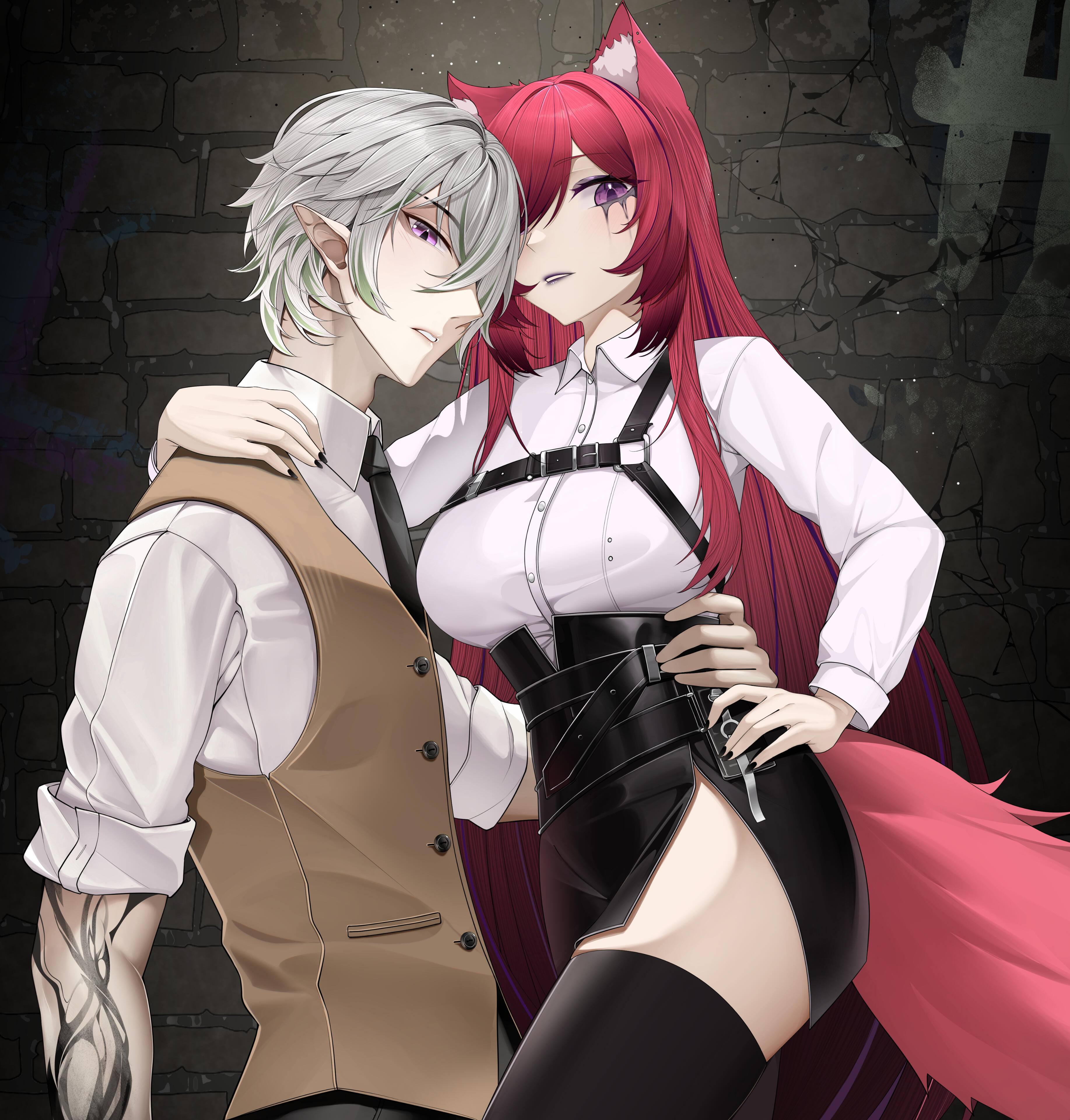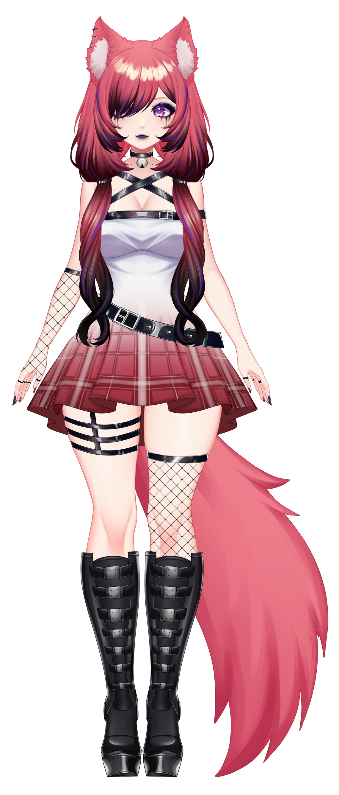 punk outfit- black tube top with belt choker, plaid half skirt half shorts, fishnet on the left arm, triple garter belt on left leg, thigh high fishnet on right leg, calf high belt boots, (hair fully down usually)